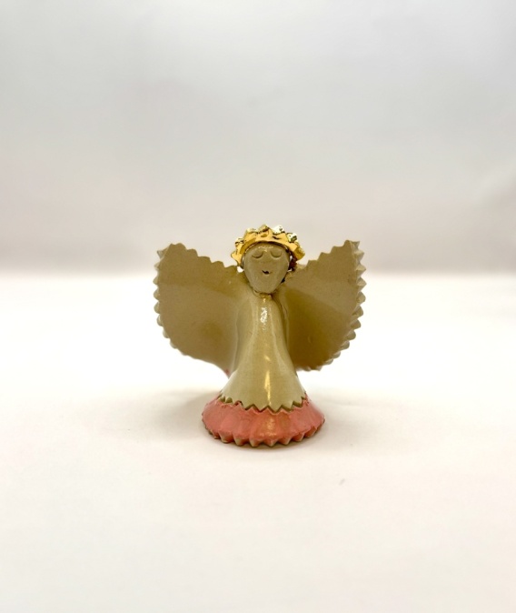 Delikatny aniołek ceramiczny wykonany ręcznie. Prosta, spokojna forma z rozłożonymi skrzydłami i złotą aureolą. Naturalna kolorystyka ceramiki przełamana subtelnym akcentem złota nadaje mu ciepły, harmonijny charakter.